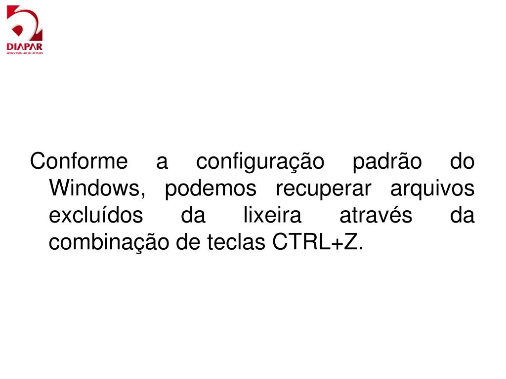 Conforme a configuração padrão do Windows, podemos recuperar arquivos excluídos da lixeira através da combinação de teclas CTRL+Z.