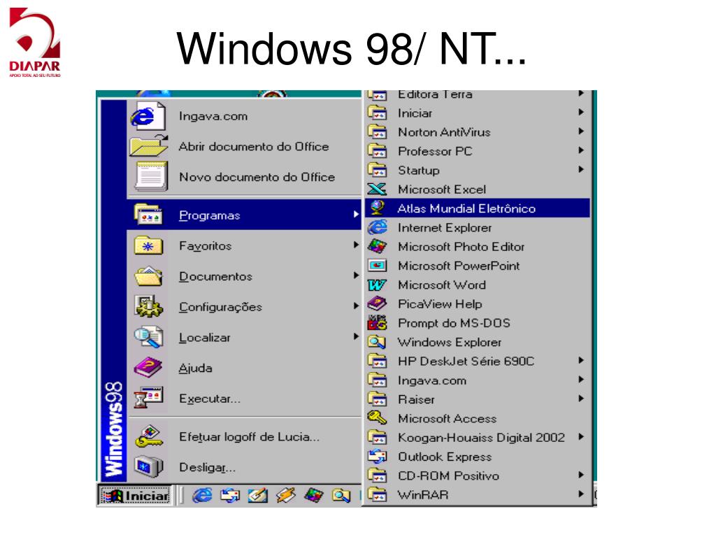 Os nomes de arquivo no Windows 98 podem conter até 255 caracteres, incluindo espaços. Entretanto, não podem conter nenhum dos seguintes caracteres: \ / : * ? ” < > | Extensão do nome dos arquivos: nome arquivo + sinal gráfico de ponto + três letras: PowerPoint - extensão .PPT Word - extensão .DOC Excel - extensão .XLS