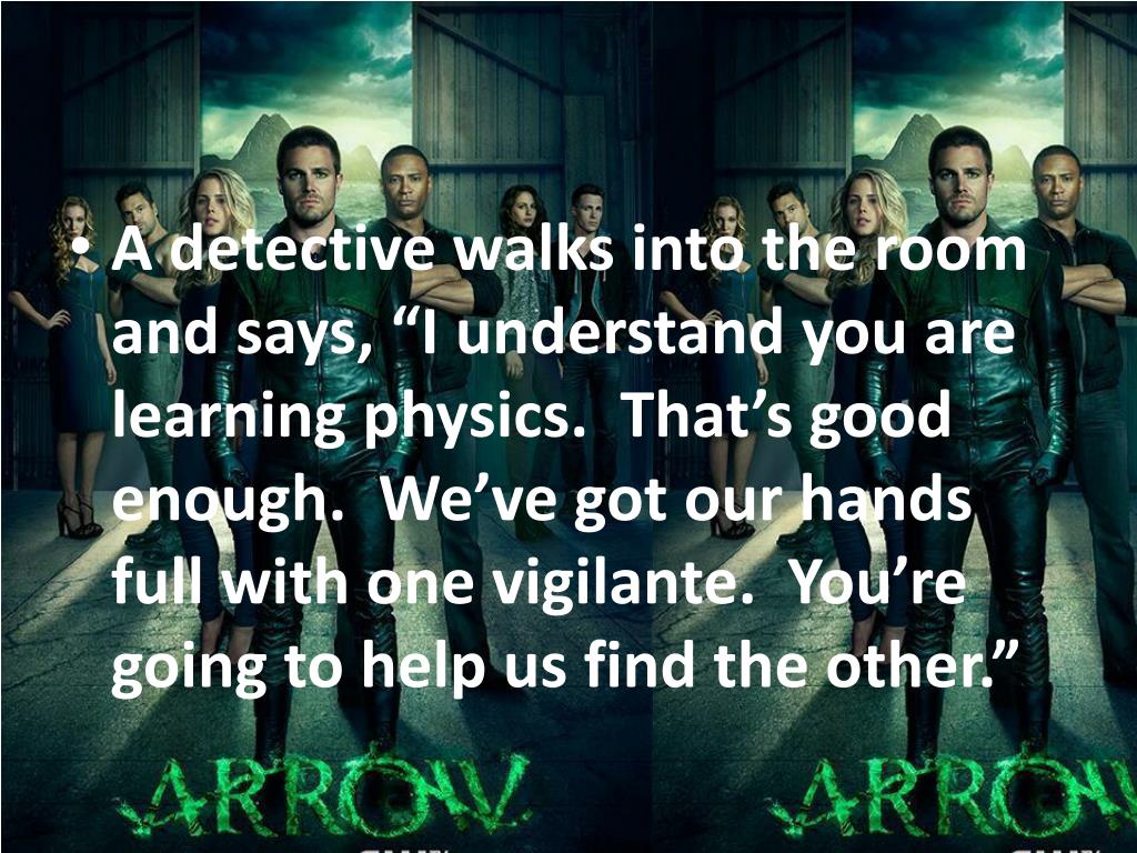 A detective walks into the room and says, “I understand you are learning physics. That’s good enough. We’ve got our hands full with one vigilante. You’re going to help us find the other.”