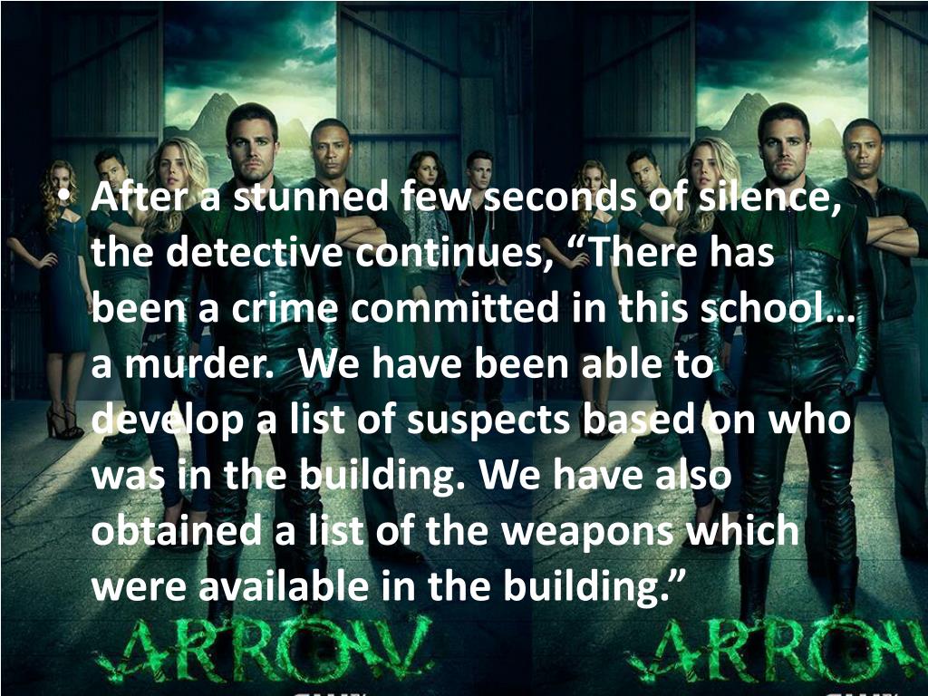 After a stunned few seconds of silence, the detective continues, “There has been a crime committed in this school… a murder. We have been able to develop a list of suspects based on who was in the building. We have also obtained a list of the weapons which were available in the building.”