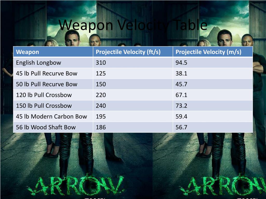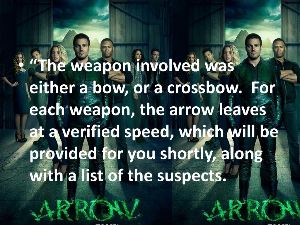 “The weapon involved was either a bow, or a crossbow. For each weapon, the arrow leaves at a verified speed, which will be provided for you shortly, along with a list of the suspects.
