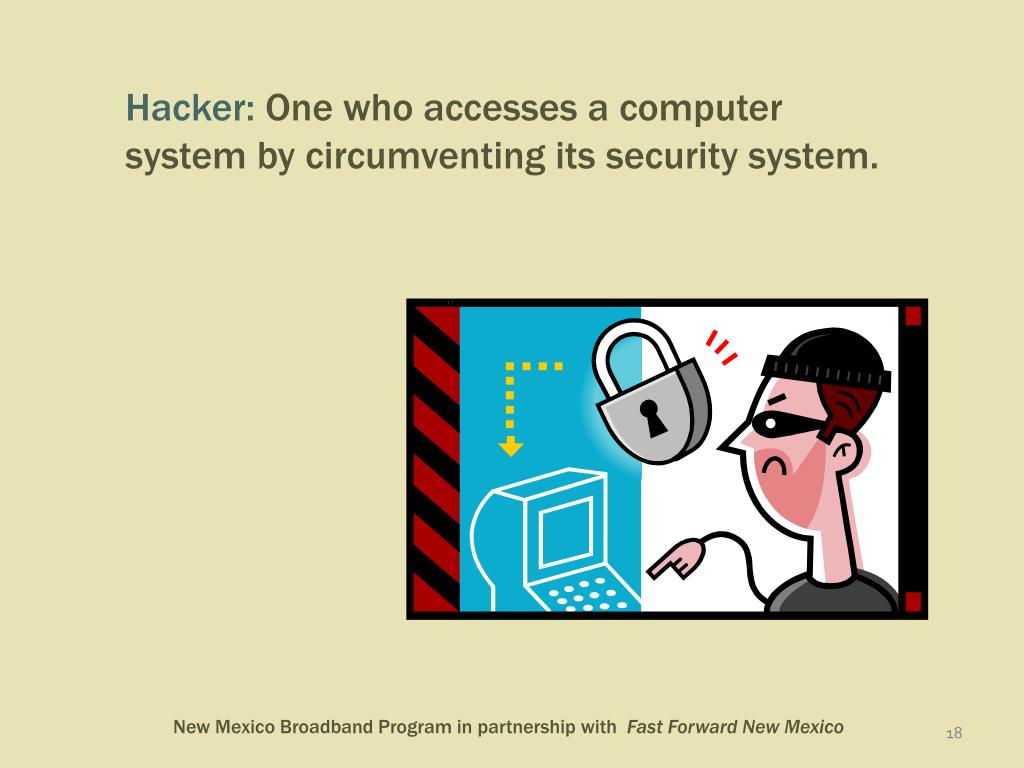 Hacker: One who accesses a computer system by circumventing its security system.
