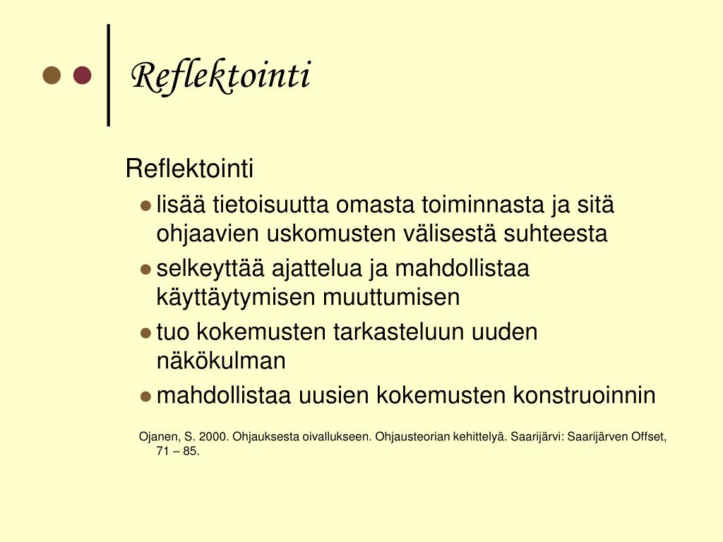 Reflektointi • Reflektointi • lisää tietoisuutta omasta toiminnasta ja sitä ohjaavien uskomusten välisestä suhteesta • selkeyttää ajattelua ja mahdollistaa käyttäytymisen muuttumisen • tuo kokemusten tarkasteluun uuden näkökulman • mahdollistaa uusien kokemusten konstruoinnin Ojanen, S. 2000. Ohjauksesta oivallukseen. Ohjausteorian kehittelyä. Saarijärvi: Saarijärven Offset, 71 – 85.