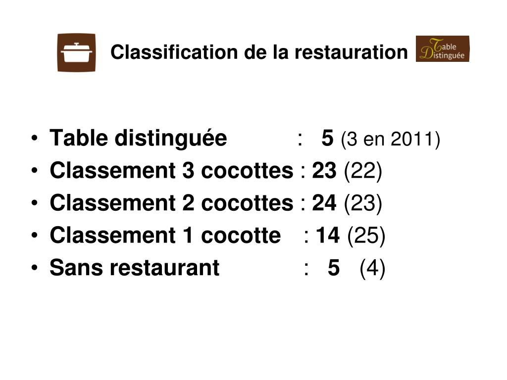 Classification de la restauration • Table distinguée : 5(3 en 2011) • Classement 3 cocottes : 23 (22) • Classement 2 cocottes : 24 (23) • Classement 1 cocotte : 14 (25) • Sans restaurant : 5 (4)