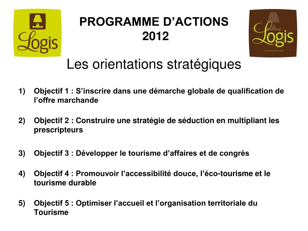 PROGRAMME D’ACTIONS 2012 Les orientations stratégiques • Objectif 1 : S’inscrire dans une démarche globale de qualification de l’offre marchande • Objectif 2 : Construire une stratégie de séduction en multipliant les prescripteurs • Objectif 3 : Développer le tourisme d’affaires et de congrès • Objectif 4 : Promouvoir l’accessibilité douce, l’éco-tourisme et le tourisme durable • Objectif 5 : Optimiser l’accueil et l’organisation territoriale du Tourisme