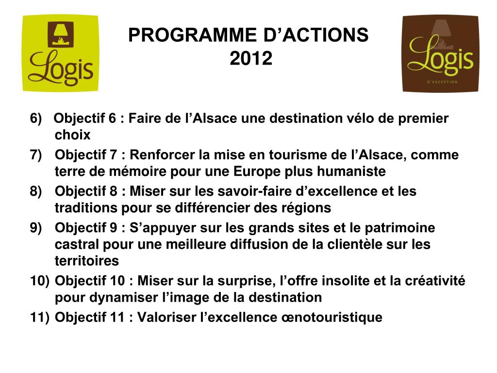 PROGRAMME D’ACTIONS 2012 6) Objectif 6 : Faire de l’Alsace une destination vélo de premier choix • Objectif 7 : Renforcer la mise en tourisme de l’Alsace, comme terre de mémoire pour une Europe plus humaniste • Objectif 8 : Miser sur les savoir-faire d’excellence et les traditions pour se différencier des régions • Objectif 9 : S’appuyer sur les grands sites et le patrimoine castral pour une meilleure diffusion de la clientèle sur les territoires • Objectif 10 : Miser sur la surprise, l’offre insolite et la créativité pour dynamiser l’image de la destination • Objectif 11 : Valoriser l’excellence œnotouristique