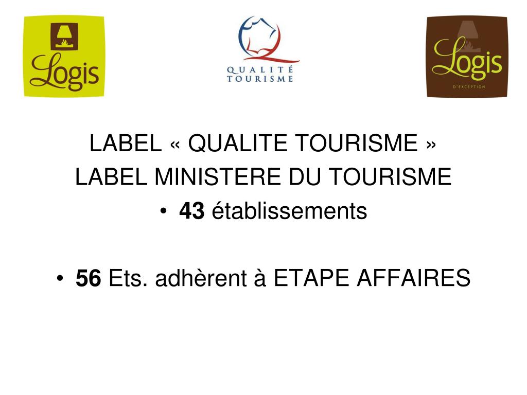 LABEL « QUALITE TOURISME » LABEL MINISTERE DU TOURISME • 43 établissements • 56 Ets. adhèrent à ETAPE AFFAIRES