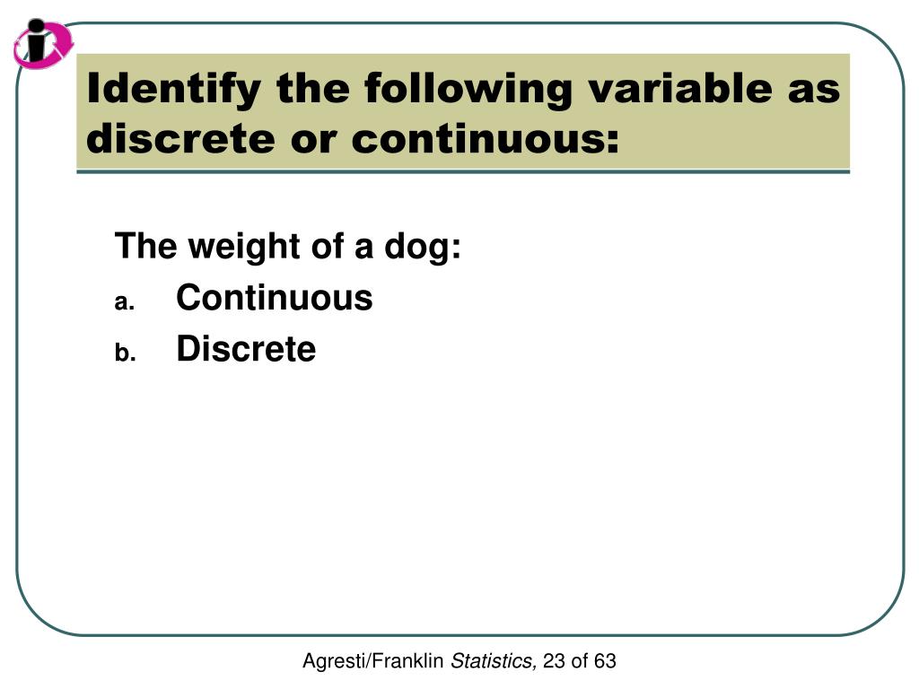 Identify the following variable as discrete or continuous: The weight of a dog: • Continuous • Discrete