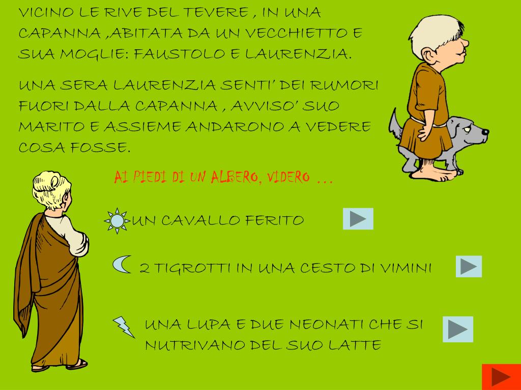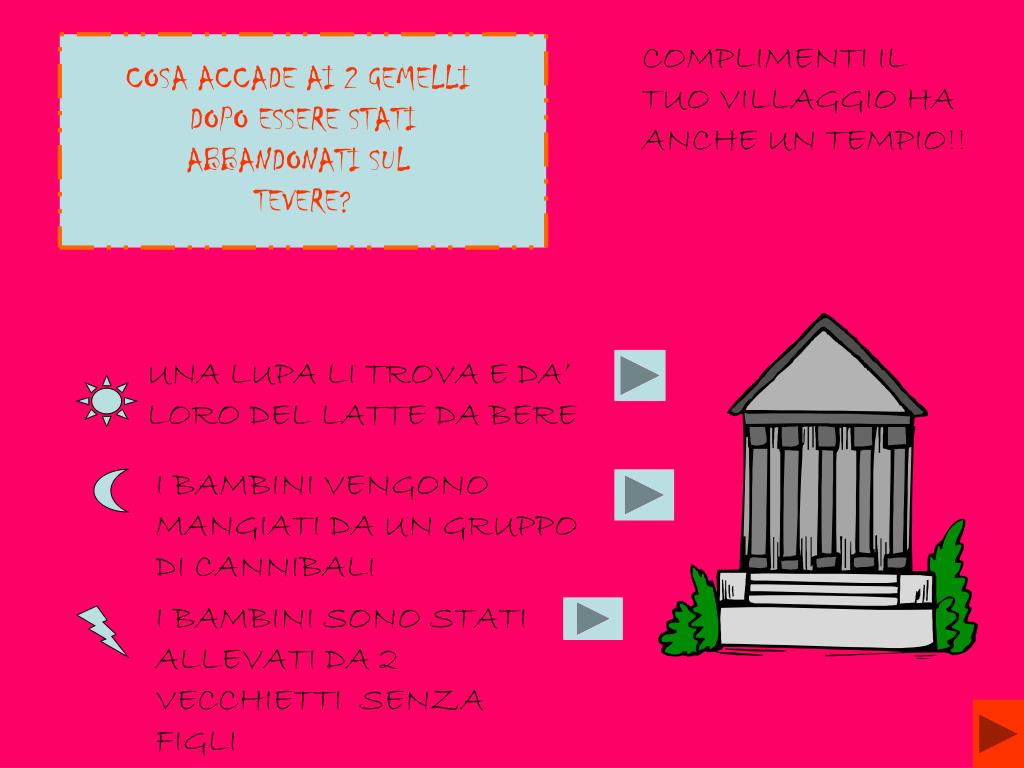 COSA ACCADE AI 2 GEMELLI DOPO ESSERE STATI ABBANDONATI SUL TEVERE? COMPLIMENTI IL TUO VILLAGGIO HA ANCHE UN TEMPIO!! UNA LUPA LI TROVA E DA’ LORO DEL LATTE DA BERE I BAMBINI VENGONO MANGIATI DA UN GRUPPO DI CANNIBALI I BAMBINI SONO STATI ALLEVATI DA 2 VECCHIETTI SENZA FIGLI