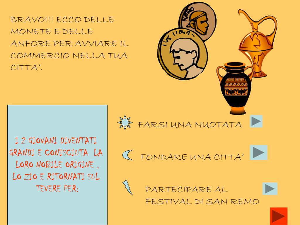 BRAVO!!! ECCO DELLE MONETE E DELLE ANFORE PER AVVIARE IL COMMERCIO NELLA TUA CITTA’. I 2 GIOVANI DIVENTATI GRANDI E CONISCIUTA LA LORO NOBILE ORIGINE , LO ZIO E RITORNATI SUL TEVERE PER: FARSI UNA NUOTATA FONDARE UNA CITTA’ PARTECIPARE AL FESTIVAL DI SAN REMO
