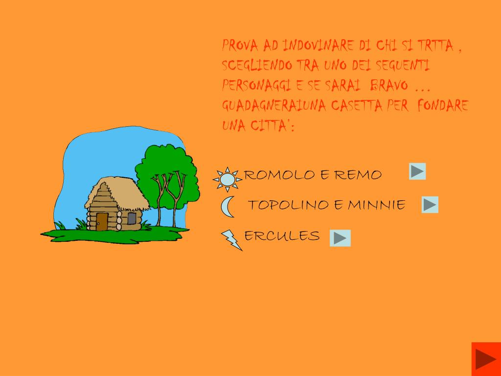 IN PRINCIPIO ERA IL … MITO. UN PERCORSO AD OSTACOLI TRA DOMANDE E TRABOCCHETTI PER SCOPRIRE INSIEME … L’ ORIGINE DI ROMA. PROVA AD INDOVINARE DI CHI SI TRTTA , SCEGLIENDO TRA UNO DEI SEGUENTI PERSONAGGI E SE SARAI BRAVO … GUADAGNERAIUNA CASETTA PER FONDARE UNA CITTA’:. ROMOLO E REMO