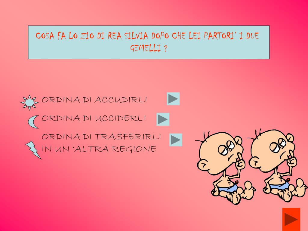 COSA FA LO ZIO DI REA SILVIA DOPO CHE LEI PARTORI’ I DUE GEMELLI ? ORDINA DI ACCUDIRLI ORDINA DI UCCIDERLI ORDINA DI TRASFERIRLI IN UN ‘ALTRA REGIONE