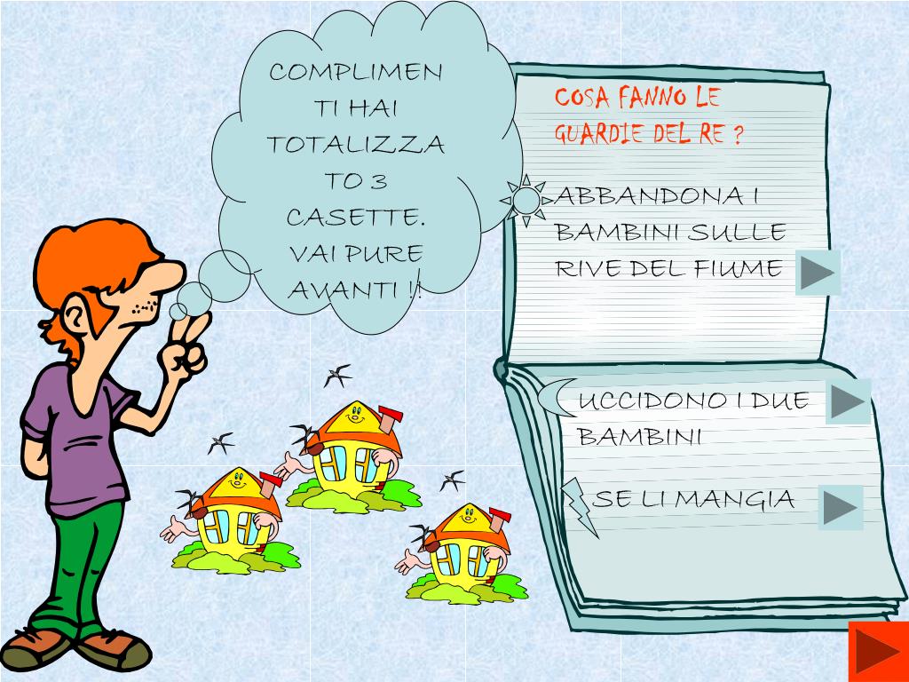 COMPLIMENTI HAI TOTALIZZATO 3 CASETTE. VAI PURE AVANTI !! COSA FANNO LE GUARDIE DEL RE ? ABBANDONA I BAMBINI SULLE RIVE DEL FIUME UCCIDONO I DUE BAMBINI SE LI MANGIA