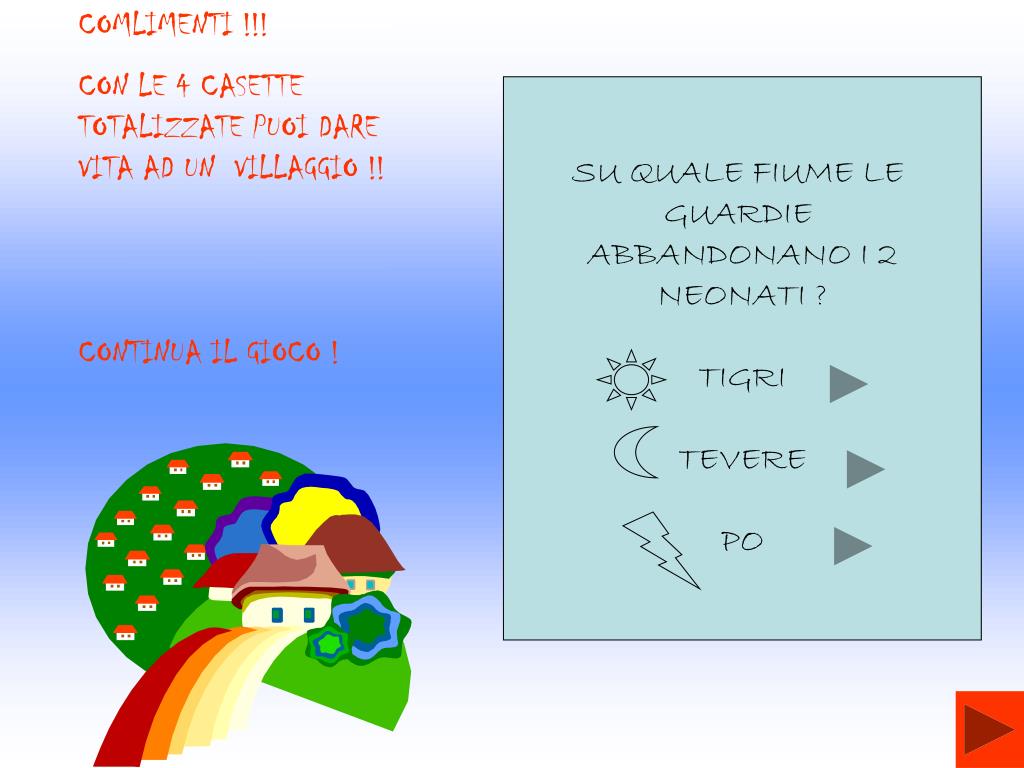 COMLIMENTI !!! CON LE 4 CASETTE TOTALIZZATE PUOI DARE VITA AD UN VILLAGGIO !! CONTINUA IL GIOCO ! SU QUALE FIUME LE GUARDIE ABBANDONANO I 2 NEONATI ? TIGRI TEVERE PO