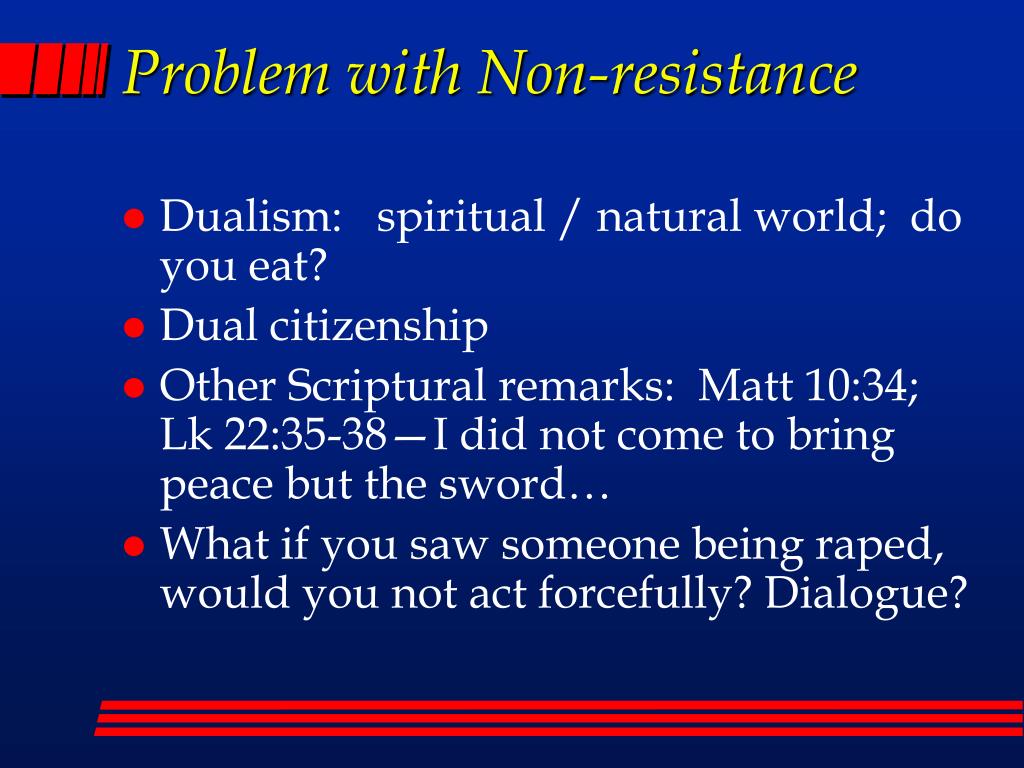 Problem with Non-resistance • Dualism: spiritual / natural world; do you eat? • Dual citizenship • Other Scriptural remarks: Matt 10:34; Lk 22:35-38—I did not come to bring peace but the sword… • What if you saw someone being raped, would you not act forcefully? Dialogue?
