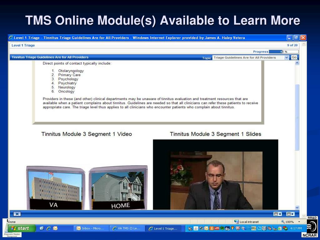Key Points Level 1 Triage In-Service • Spotlight the problem of tinnitus to VA • Explain the referral providers’ important role in triaging their patients who self reports problematic tinnitus • Explain your (the audiologist) role in providing PTM • Provide informational handouts and reference sources to learn more