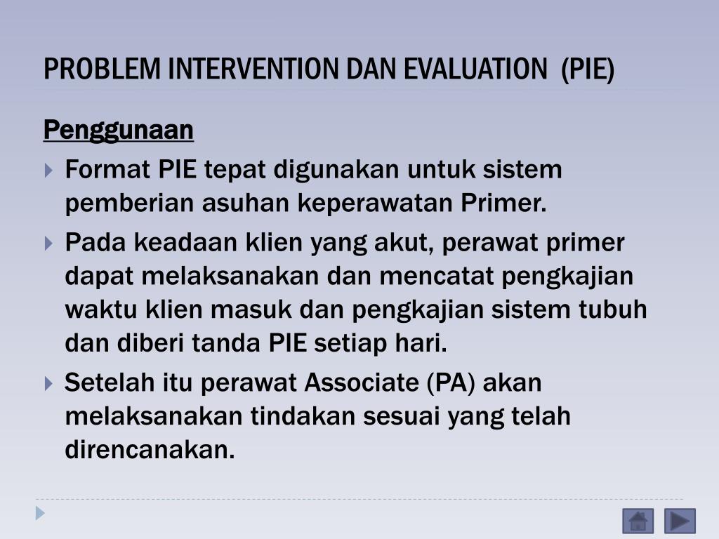 PROBLEM INTERVENTION DAN EVALUATION (PIE) Penggunaan • Format PIE tepat digunakan untuk sistem pemberian asuhan keperawatan Primer. • Padakeadaanklien yang akut, perawat primer dapatmelaksanakandanmencatatpengkajianwaktuklienmasukdanpengkajiansistemtubuhdandiberitanda PIE setiaphari. • Setelahituperawat Associate (PA) akanmelaksanakantindakansesuai yang telahdirencanakan.