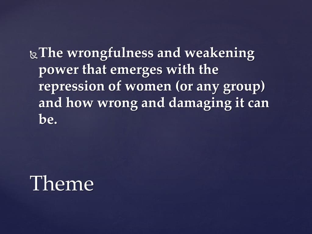 The wrongfulness and weakening power that emerges with the repression of women (or any group) and how wrong and damaging it can be. Theme