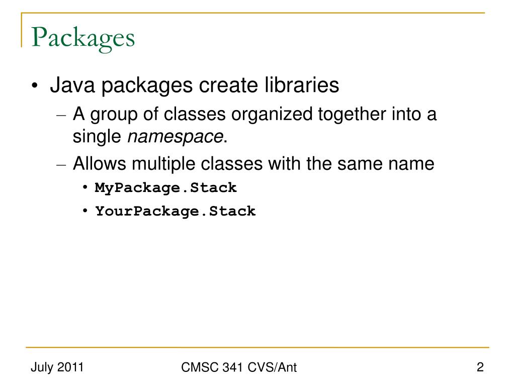 Java Packages Ant CVS Project Submission. CMSC 341. Packages. Java packages create libraries A group of classes organized together into a single namespace . Allows multiple classes with the same name MyPackage.Stack YourPackage.Stack. Packages. A file may belong to only one package.