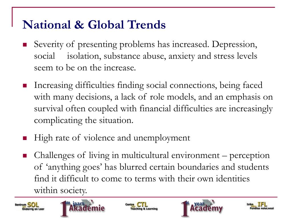 National & Global Trends • Severity of presenting problems has increased. Depression, social isolation, substance abuse, anxiety and stress levels seem to be on the increase. • Increasing difficulties finding social connections, being faced with many decisions, a lack of role models, and an emphasis on survival often coupled with financial difficulties are increasingly complicating the situation. • High rate of violence and unemployment • Challenges of living in multicultural environment – perception of ‘anything goes’ has blurred certain boundaries and students find it difficult to come to terms with their own identities within society.