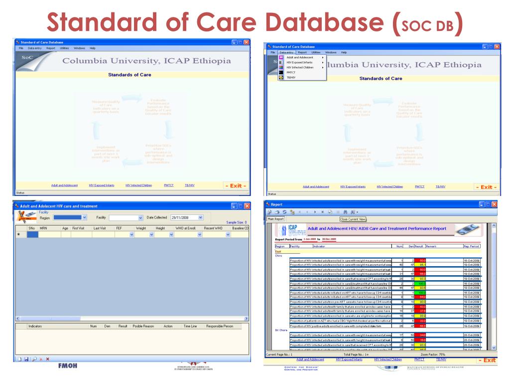 ICAP –Ethiopia Internal data use for CQI • Developed & Implemented database to timely organize the different aggregate data, - DSS, TrainSoft, SOCS and CSSCL Databases • DSS: Organize service delivery performance aggregate data; produce report and graph • TrainSoft: Organize training data by all technical areas • SOCS: Organize data from SOC exercise & facilitate immediate feedback and see trends in the SOC indicators • CSSCL: Organize data from CSSCL exercise & facilitate immediate feedback and see trends in the SOC indicators