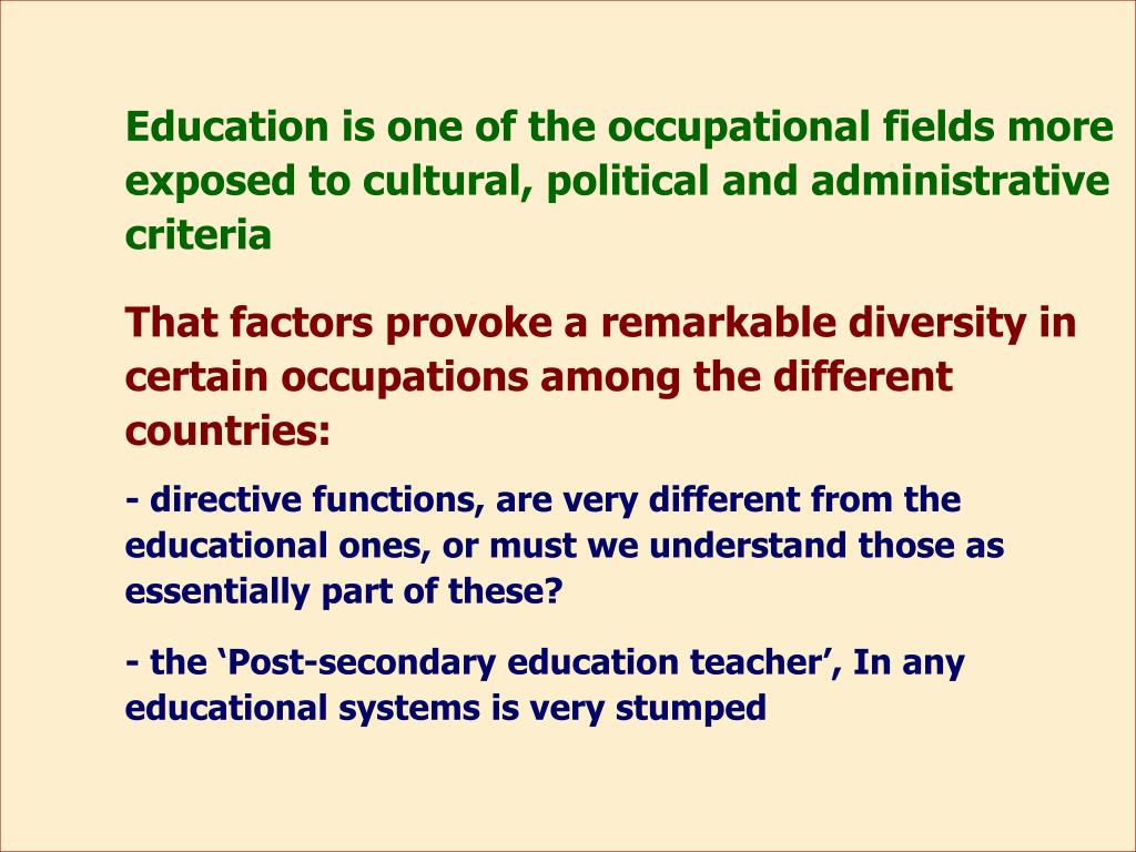Education is one of the occupational fields more exposed to cultural, political and administrative criteriaThat factors provoke a remarkable diversity in certain occupations among the different countries:- directive functions, are very different from the educational ones, or must we understand those as essentially part of these? - the ‘Post-secondary education teacher’, In any educational systems is very stumped