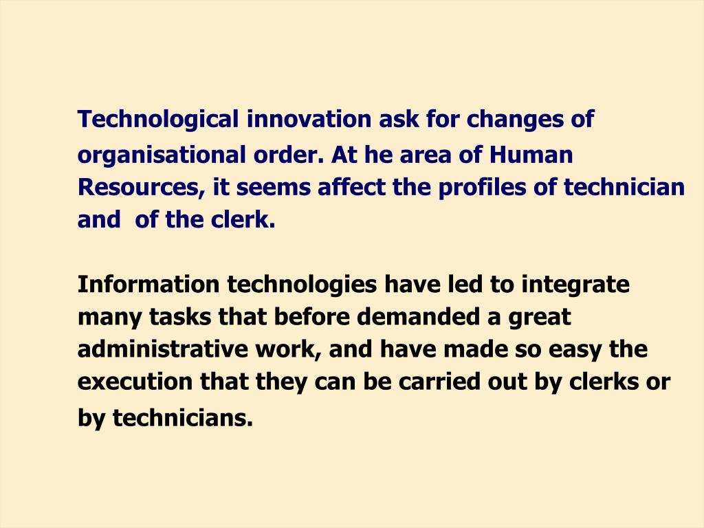 Technological innovation ask for changes of organisational order. At he area of Human Resources, it seems affect the profiles of technician and of the clerk. Information technologies have led to integrate many tasks that before demanded a great administrative work, and have made so easy the execution that they can be carried out by clerks or by technicians.