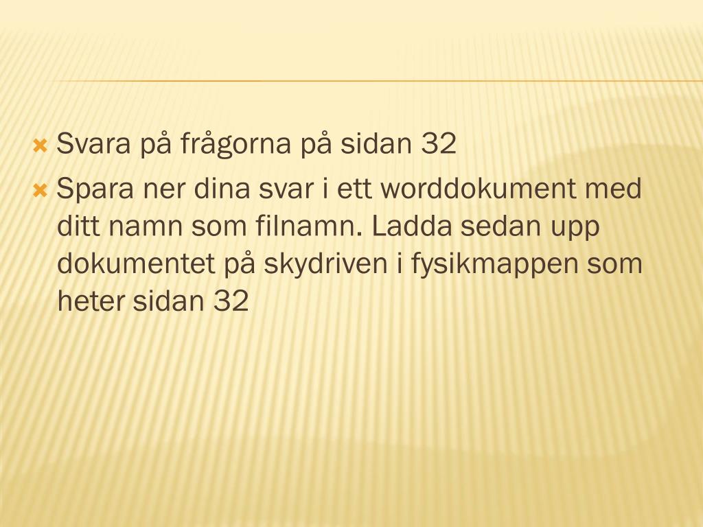 Svara på frågorna på sidan 32 Spara ner dina svar i ett worddokument med ditt namn som filnamn. Ladda sedan upp dokumentet på skydriven i fysikmappen som heter sidan 32