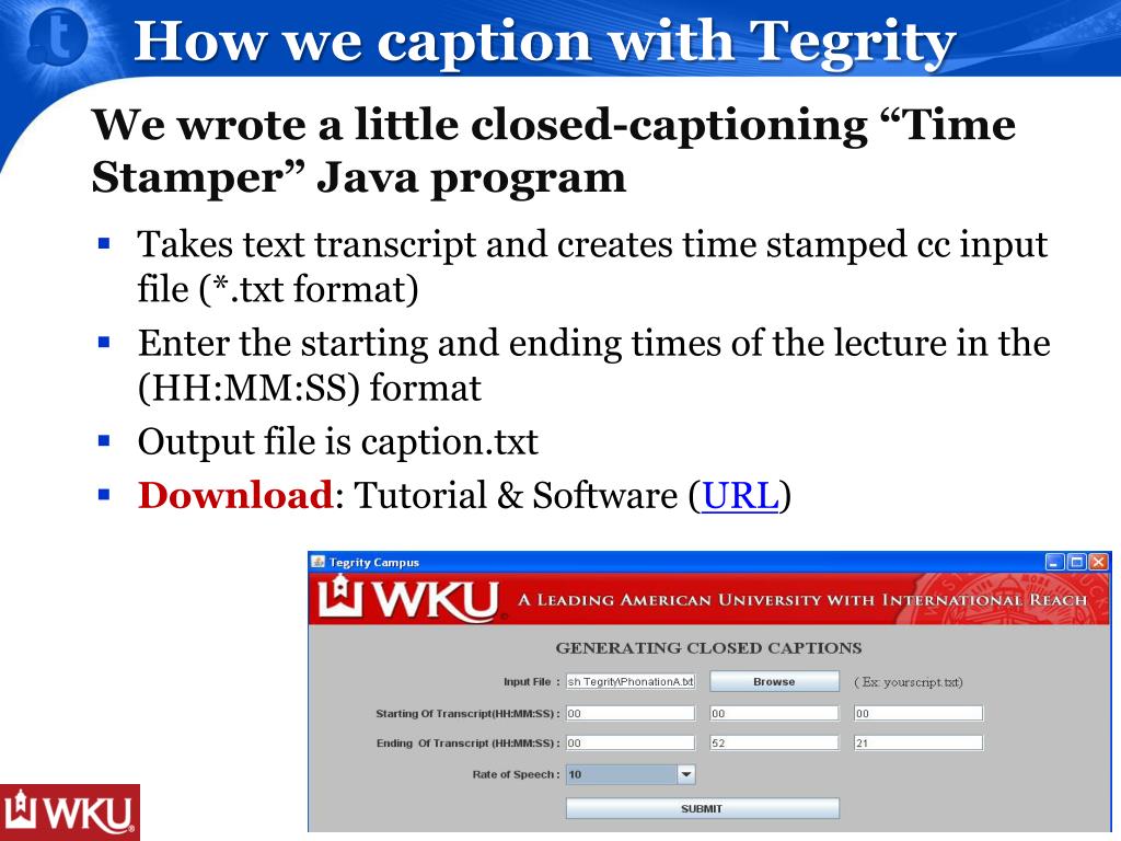 We wrote a little closed-captioning “Time Stamper” Java program How we caption with Tegrity • Takes text transcript and creates time stamped cc input file (*.txt format) • Enter the starting and ending times of the lecture in the (HH:MM:SS) format • Output file is caption.txt • Download: Tutorial & Software (URL)