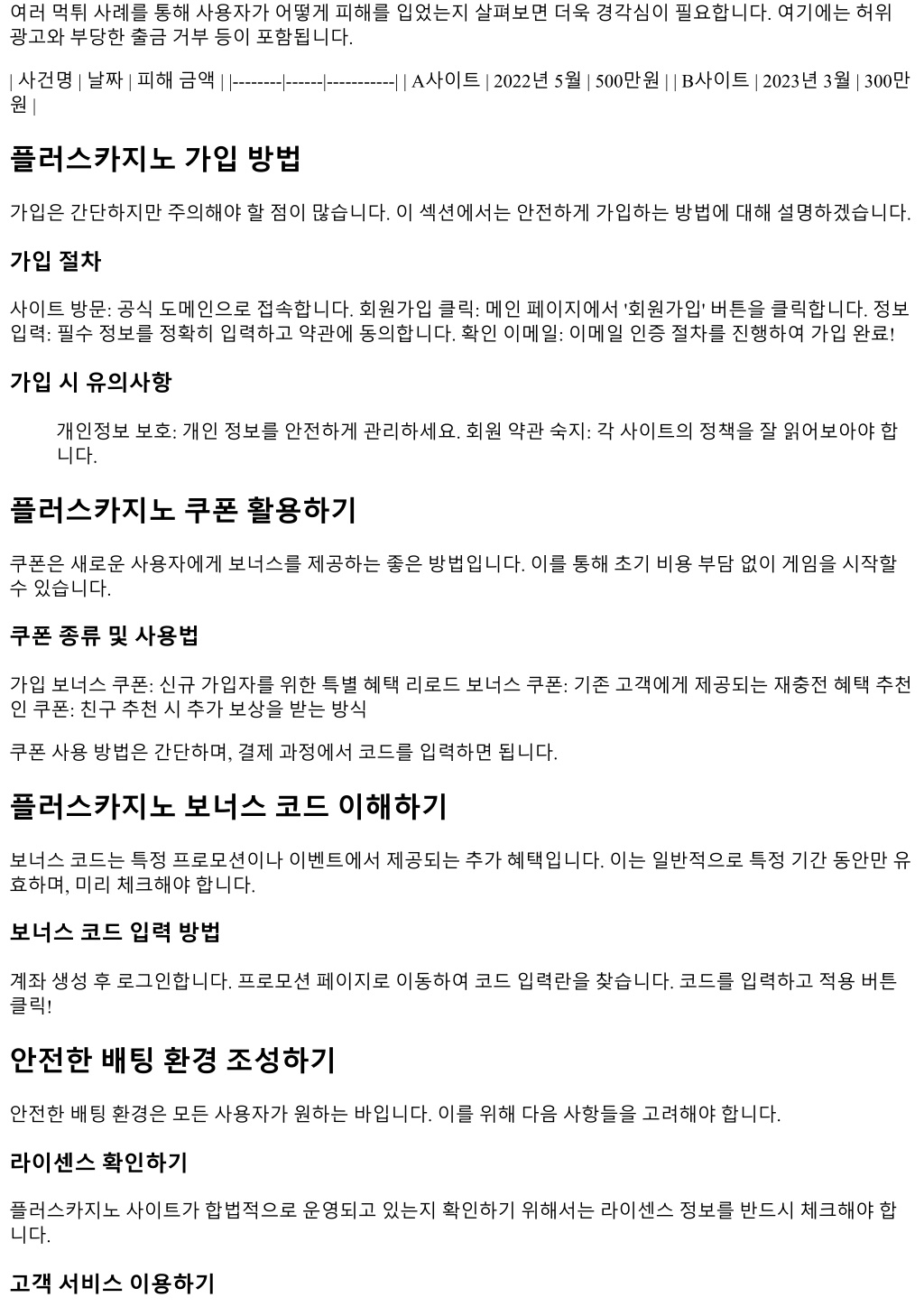 여러먹튀사례를통해사용자가어떻게피해를입었는지살펴보면더욱경각심이필요합니다. 여기에는허위 광고와부당한출금거부등이포함됩니다. | 사건명 | 날짜 | 피해금액 | |--------|------|-----------| | A사이트 | 2022년 5월 | 500만원 | | B사이트 | 2023년 3월 | 300만 원 | 플러스카지노가입방법 가입은간단하지만주의해야할점이많습니다. 이섹션에서는안전하게가입하는방법에대해설명하겠습니다. 가입절차 사이트방문: 공식도메인으로접속합니다. 회원가입클릭: 메인페이지에서 '회원가입' 버튼을클릭합니다. 정보 입력: 필수정보를정확히입력하고약관에동의합니다. 확인이메일: 이메일인증절차를진행하여가입완료! 가입시유의사항 개인정보보호: 개인정보를안전하게관리하세요. 회원약관숙지: 각사이트의정책을잘읽어보아야합 니다. 플러스카지노쿠폰활용하기 쿠폰은새로운사용자에게보너스를제공하는좋은방법입니다. 이를통해초기비용부담없이게임을시작할 수있습니다. 쿠폰종류및사용법 가입보너스쿠폰: 신규가입자를위한특별혜택리로드보너스쿠폰: 기존고객에게제공되는재충전혜택추천 인쿠폰: 친구추천시추가보상을받는방식 쿠폰사용방법은간단하며, 결제과정에서코드를입력하면됩니다. 플러스카지노보너스코드이해하기 보너스코드는특정프로모션이나이벤트에서제공되는추가혜택입니다. 이는일반적으로특정기간동안만유 효하며, 미리체크해야합니다. 보너스코드입력방법 계좌생성후로그인합니다. 프로모션페이지로이동하여코드입력란을찾습니다. 코드를입력하고적용버튼 클릭! 안전한배팅환경조성하기 안전한배팅환경은모든사용자가원하는바입니다. 이를위해다음사항들을고려해야합니다. 라이센스확인하기 플러스카지노사이트가합법적으로운영되고있는지확인하기위해서는라이센스정보를반드시체크해야합 니다. 고객서비스이용하기