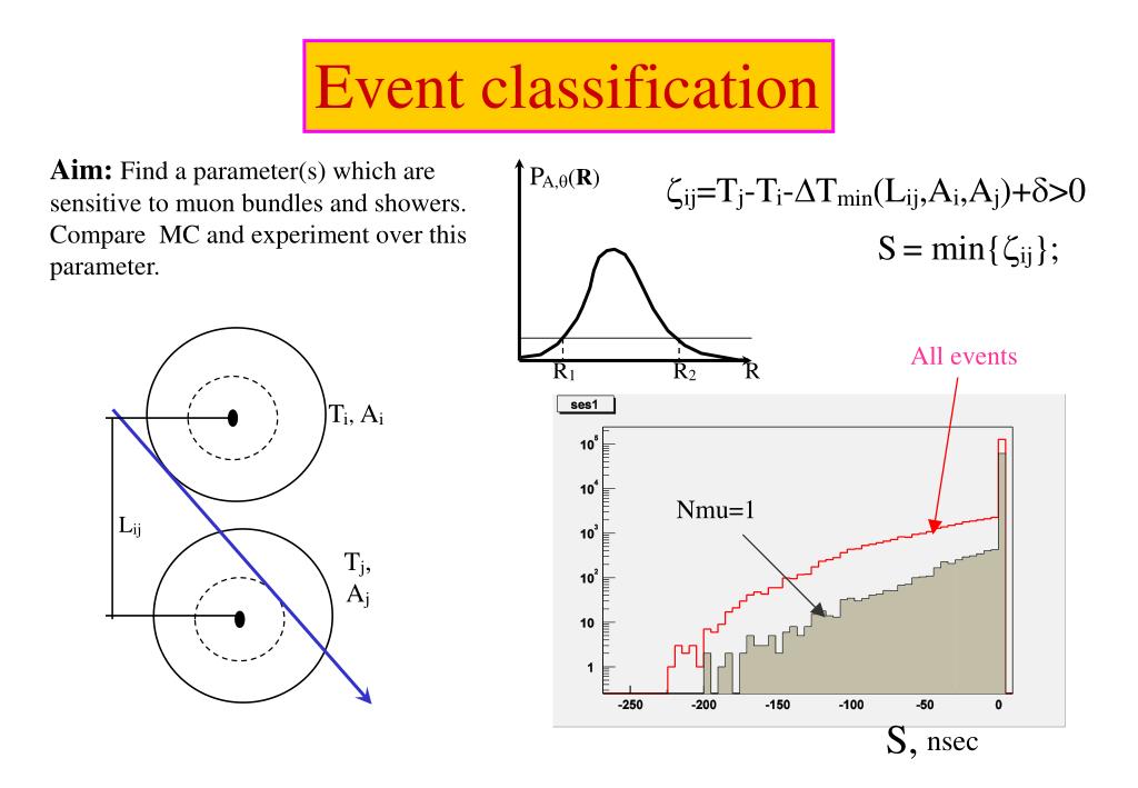 PA,q(R) Ti, Ai zij=Tj-Ti-DTmin(Lij,Ai,Aj)+d>0 S= min{zij}; Lij Tj, Aj R1 R2 R Event classification Aim: Find a parameter(s) which are sensitive to muon bundles and showers. Compare MC and experiment over this parameter. All events Nmu=1 S, nsec