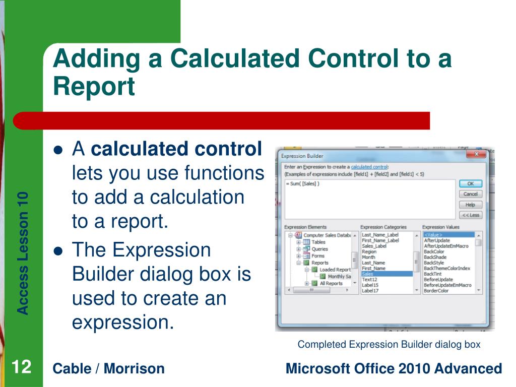 Access Lesson 10Adding Advanced Features to Reports Microsoft Office 2010 Advanced Cable / Morrison