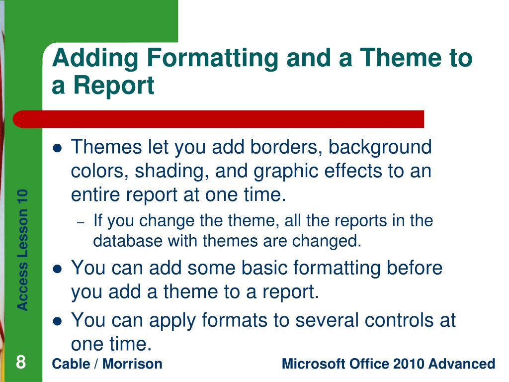 Access Lesson 10 Adding Advanced Features to Reports. Microsoft Office 2010 Advanced. Cable / Morrison. Objectives. Create a report from a parameter query. Add formatting and a theme to a report. Change a control property. Add a calculated control to a report. 2. 2.