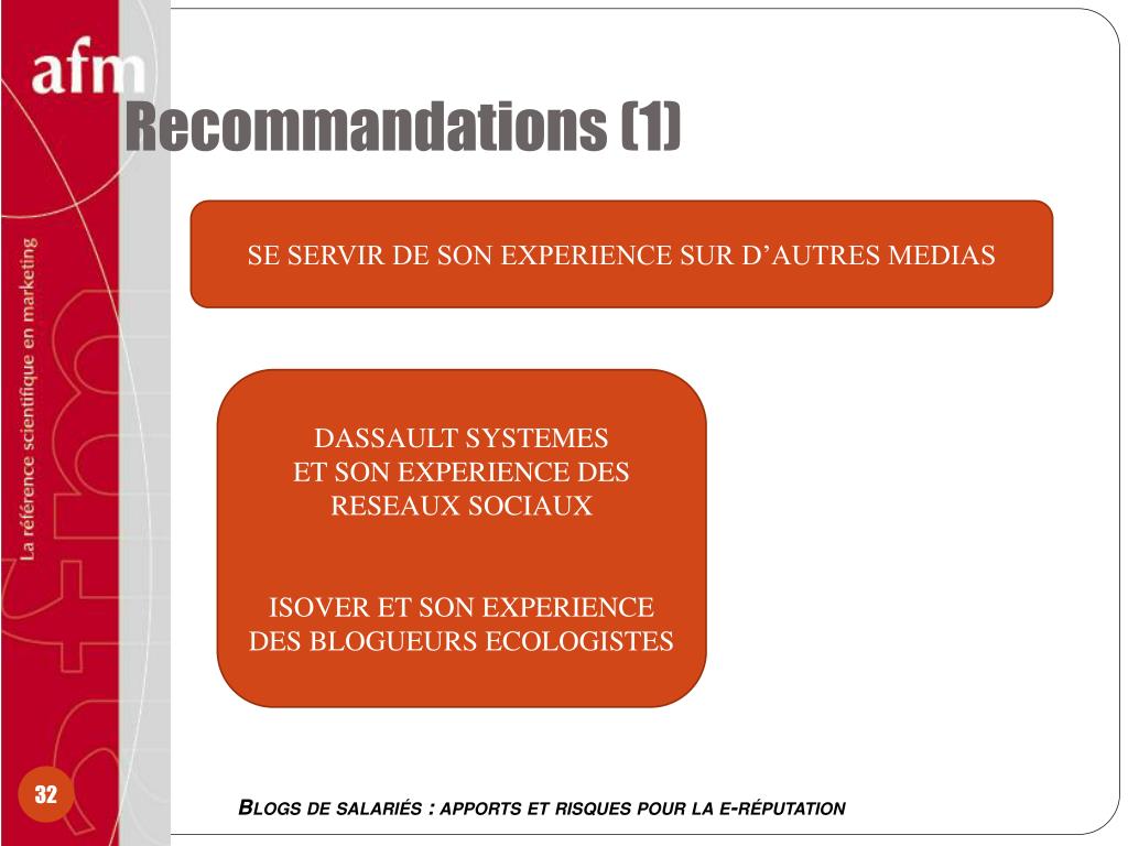 Recommandations (1) SE SERVIR DE SON EXPERIENCE SUR D’AUTRES MEDIAS DASSAULT SYSTEMES ET SON EXPERIENCE DES RESEAUX SOCIAUX ISOVER ET SON EXPERIENCE DES BLOGUEURS ECOLOGISTES Blogs de salariés : apports et risques pour la e-réputation