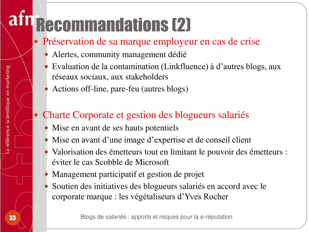 Recommandations (2) • Préservation de sa marque employeur en cas de crise • Alertes, community management dédié • Evaluation de la contamination (Linkfluence) à d’autres blogs, aux réseaux sociaux, aux stakeholders • Actions off-line, pare-feu (autres blogs) • Charte Corporate et gestion des blogueurs salariés • Mise en avant de ses hauts potentiels • Mise en avant d’une image d’expertise et de conseil client • Valorisation des émetteurs tout en limitant le pouvoir des émetteurs : éviter le cas Scobble de Microsoft • Management participatif et gestion de projet • Soutien des initiatives des blogueurs salariés en accord avec le corporate marque : les végétaliseurs d’Yves Rocher Blogs de salariés : apports et risques pour la e-réputation