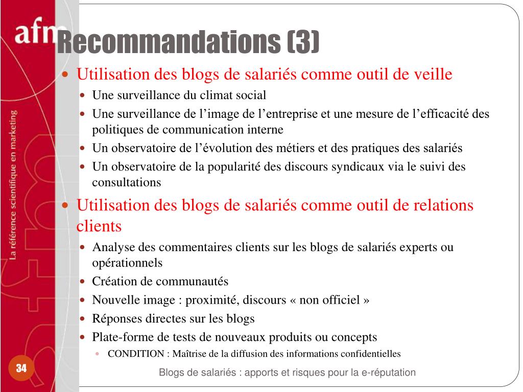 Recommandations (3) • Utilisation des blogs de salariés comme outil de veille • Une surveillance du climat social • Une surveillance de l’image de l’entreprise et une mesure de l’efficacité des politiques de communication interne • Un observatoire de l’évolution des métiers et des pratiques des salariés • Un observatoire de la popularité des discours syndicaux via le suivi des consultations • Utilisation des blogs de salariés comme outil de relations clients • Analyse des commentaires clients sur les blogs de salariés experts ou opérationnels • Création de communautés • Nouvelle image : proximité, discours « non officiel » • Réponses directes sur les blogs • Plate-forme de tests de nouveaux produits ou concepts • CONDITION : Maîtrise de la diffusion des informations confidentielles Blogs de salariés : apports et risques pour la e-réputation