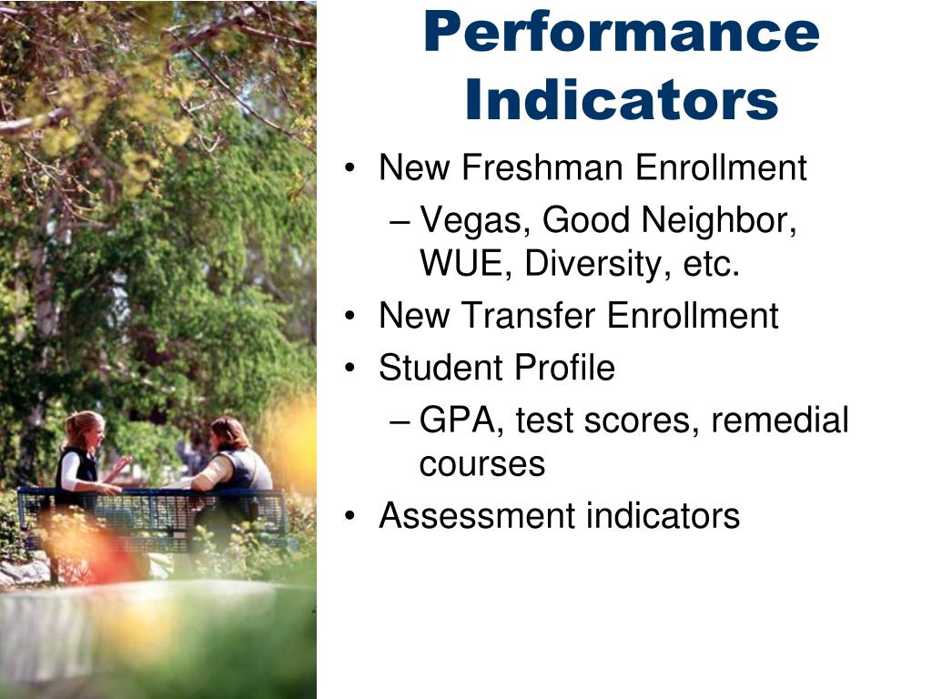Performance Indicators • New Freshman Enrollment • Vegas, Good Neighbor, WUE, Diversity, etc. • New Transfer Enrollment • Student Profile • GPA, test scores, remedial courses • Assessment indicators