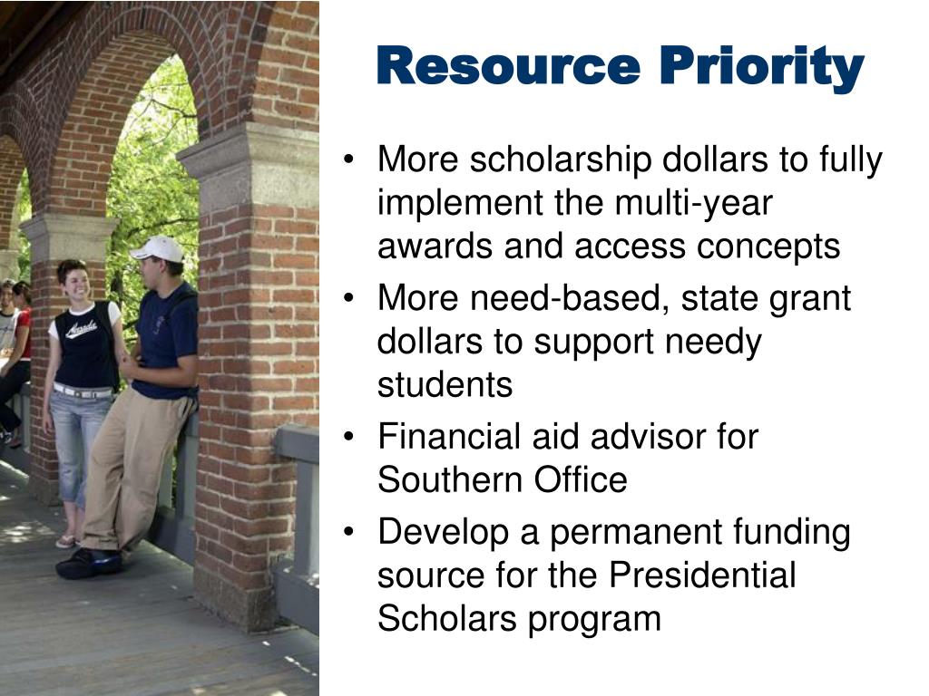Resource Priority • More scholarship dollars to fully implement the multi-year awards and access concepts • More need-based, state grant dollars to support needy students • Financial aid advisor for Southern Office • Develop a permanent funding source for the Presidential Scholars program
