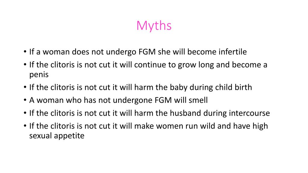 Myths • If a woman does not undergo FGM she will become infertile • If the clitoris is not cut it will continue to grow long and become a penis • If the clitoris is not cut it will harm the baby during child birth • A woman who has not undergone FGM will smell • If the clitoris is not cut it will harm the husband during intercourse • If the clitoris is not cut it will make women run wild and have high sexual appetite