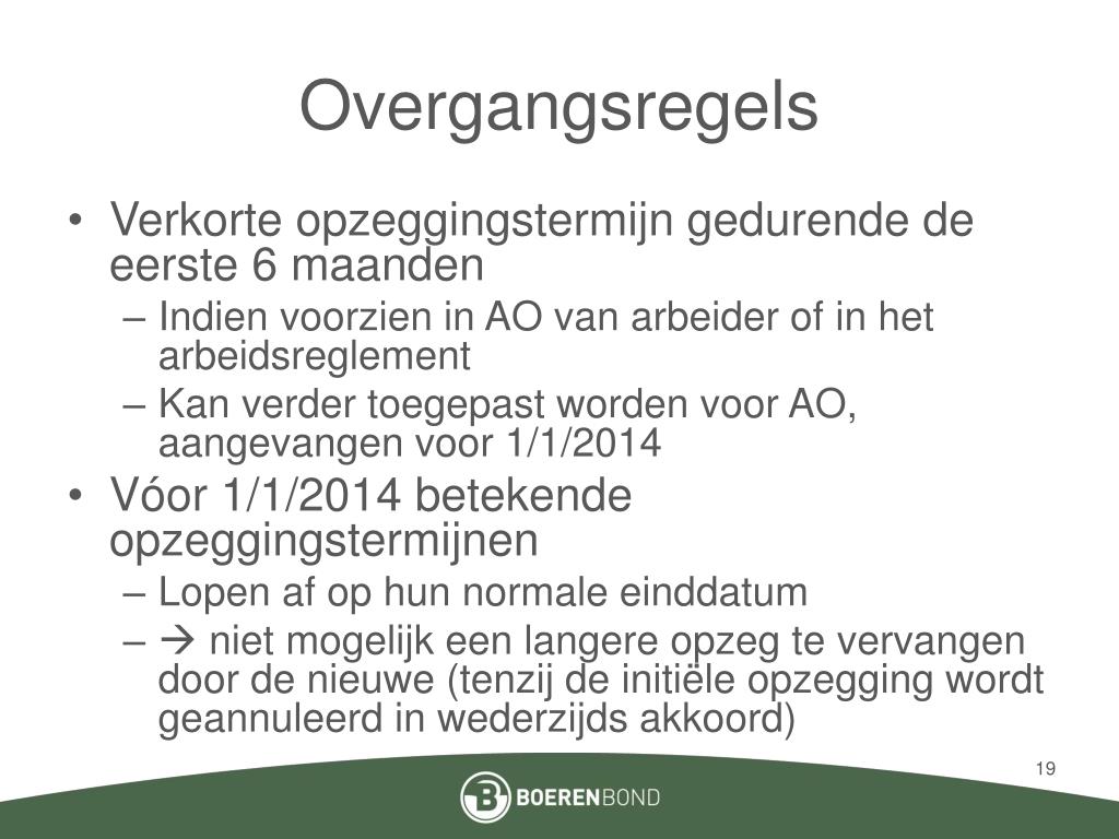 Overgangsregels • Verkorte opzeggingstermijn gedurende de eerste 6 maanden • Indien voorzien in AO van arbeider of in het arbeidsreglement • Kan verder toegepast worden voor AO, aangevangen voor 1/1/2014 • Vóor 1/1/2014 betekende opzeggingstermijnen • Lopen af op hun normale einddatum • niet mogelijk een langere opzeg te vervangen door de nieuwe (tenzij de initiële opzegging wordt geannuleerd in wederzijds akkoord)