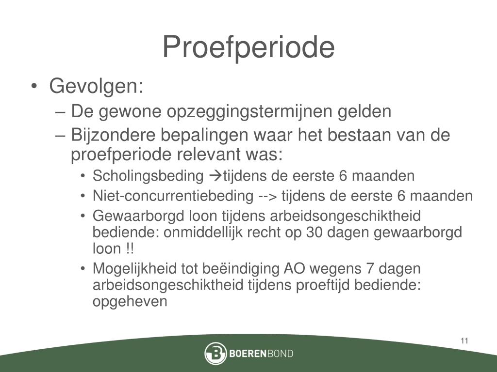 Proefperiode • Gevolgen: • De gewone opzeggingstermijnen gelden • Bijzondere bepalingen waar het bestaan van de proefperiode relevant was: • Scholingsbeding tijdens de eerste 6 maanden • Niet-concurrentiebeding --> tijdens de eerste 6 maanden • Gewaarborgd loon tijdens arbeidsongeschiktheid bediende: onmiddellijk recht op 30 dagen gewaarborgd loon !! • Mogelijkheid tot beëindiging AO wegens 7 dagen arbeidsongeschiktheid tijdens proeftijd bediende: opgeheven