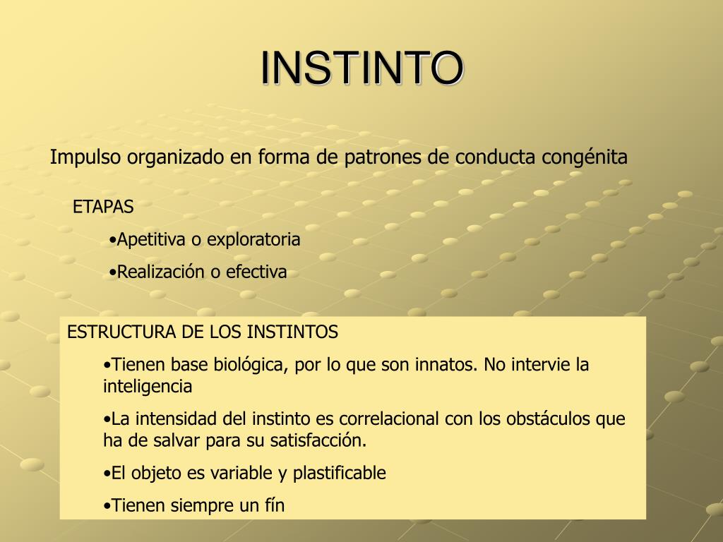 INSTINTO Impulso organizado en forma de patrones de conducta congénita • ETAPAS • Apetitiva o exploratoria • Realización o efectiva • ESTRUCTURA DE LOS INSTINTOS • Tienen base biológica, por lo que son innatos. No intervie la inteligencia • La intensidad del instinto es correlacional con los obstáculos que ha de salvar para su satisfacción. • El objeto es variable y plastificable • Tienen siempre un fín