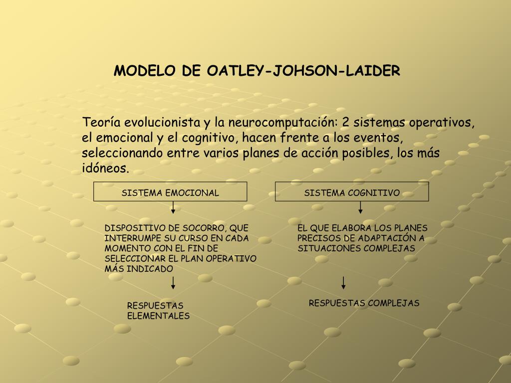 MODELO DE OATLEY-JOHSON-LAIDER Teoría evolucionista y la neurocomputación: 2 sistemas operativos, el emocional y el cognitivo, hacen frente a los eventos, seleccionando entre varios planes de acción posibles, los más idóneos. SISTEMA EMOCIONAL SISTEMA COGNITIVO DISPOSITIVO DE SOCORRO, QUE INTERRUMPE SU CURSO EN CADA MOMENTO CON EL FIN DE SELECCIONAR EL PLAN OPERATIVO MÁS INDICADO EL QUE ELABORA LOS PLANES PRECISOS DE ADAPTACIÓN A SITUACIONES COMPLEJAS RESPUESTAS COMPLEJAS RESPUESTAS ELEMENTALES