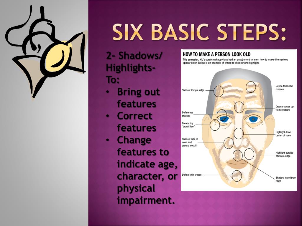 Six Basic Steps: • 2- Shadows/ Highlights- • To: • Bring out features • Correct features • Change features to indicate age, character, or physical impairment.
