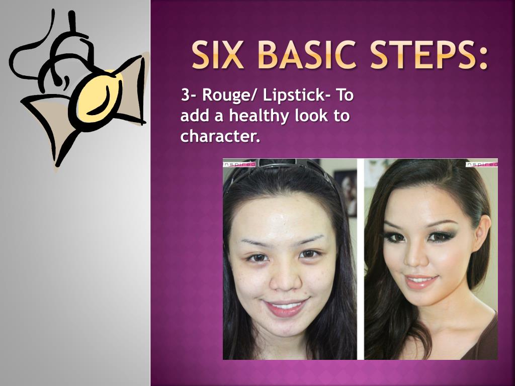 Six Basic Steps: 3- Rouge/ Lipstick- To add a healthy look to character.