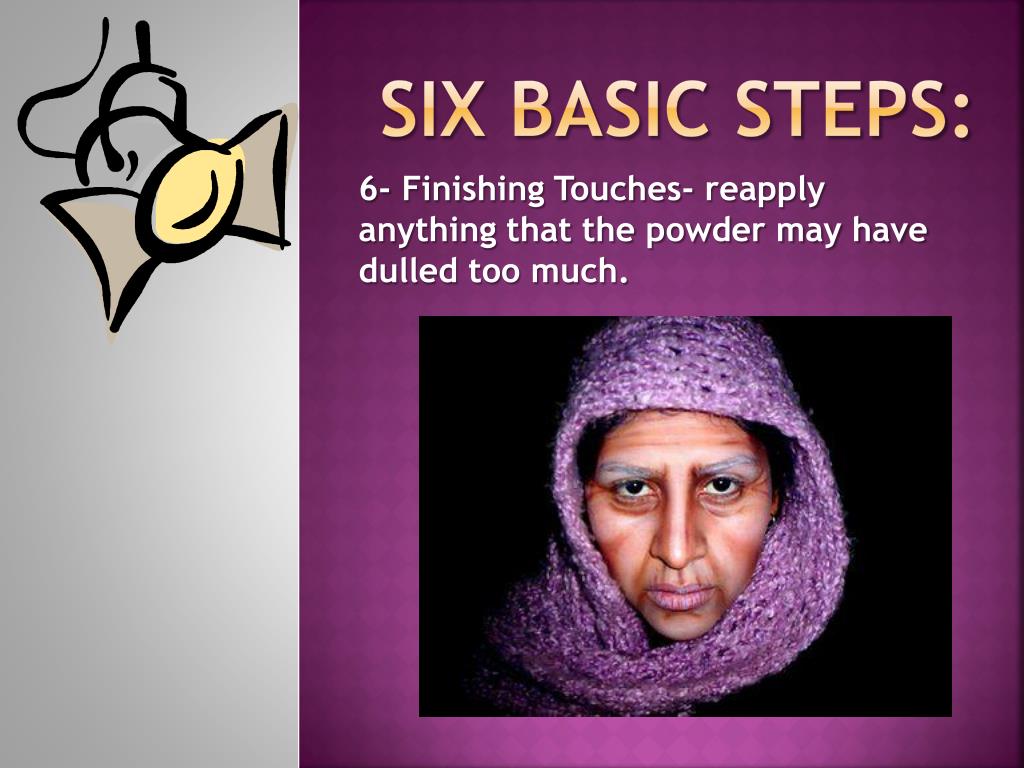Six Basic Steps: 6- Finishing Touches- reapply anything that the powder may have dulled too much.