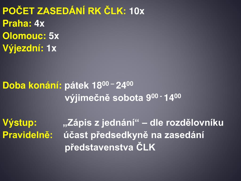 POČET ZASEDÁNÍ RK ČLK: 10x Praha: 4x Olomouc: 5x Výjezdní: 1x Doba konání: pátek 1800 – 2400 výjimečně sobota 900 - 1400 Výstup: „Zápis z jednání“ – dle rozdělovníku Pravidelně: účast předsedkyně na zasedání představenstva ČLK