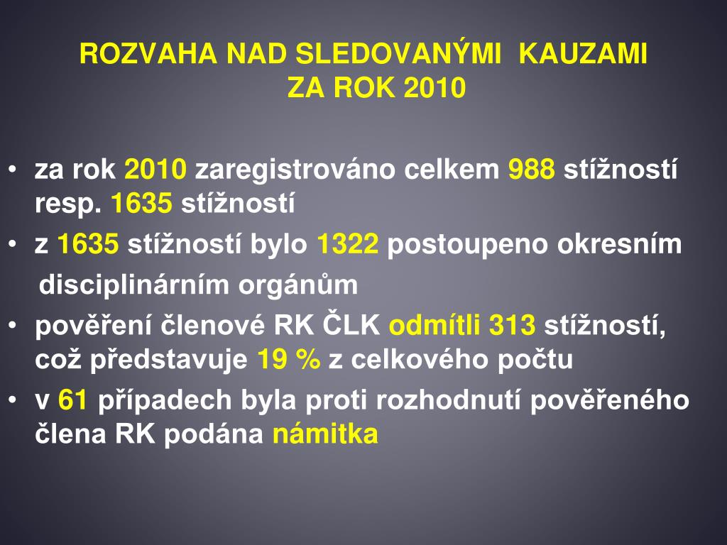 ROZVAHA NAD SLEDOVANÝMI KAUZAMIZA ROK 2010 • za rok 2010 zaregistrováno celkem 988 stížností resp. 1635 stížností • z 1635 stížností bylo 1322 postoupeno okresním disciplinárním orgánům • pověření členové RK ČLK odmítli 313 stížností, což představuje 19 % z celkového počtu • v 61 případech byla proti rozhodnutí pověřeného člena RK podána námitka