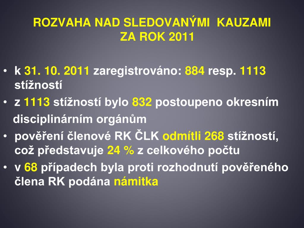 ROZVAHA NAD SLEDOVANÝMI KAUZAMIZA ROK 2011 • k 31. 10. 2011 zaregistrováno: 884 resp. 1113 stížností • z1113 stížností bylo832postoupeno okresním disciplinárním orgánům • pověření členové RK ČLK odmítli268stížností, což představuje 24 % z celkového počtu • v 68případech byla proti rozhodnutí pověřeného člena RK podána námitka