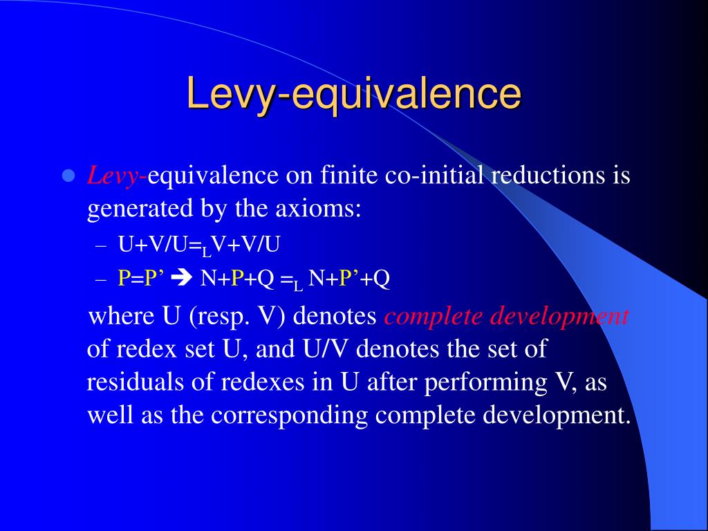 Levy-equivalence • Levy-equivalence on finite co-initial reductions is generated by the axioms: • U+V/U=LV+V/U • P=P’ N+P+Q =L N+P’+Q where U (resp. V) denotes complete development of redex set U, and U/V denotes the set of residuals of redexes in U after performing V, as well as the corresponding complete development.